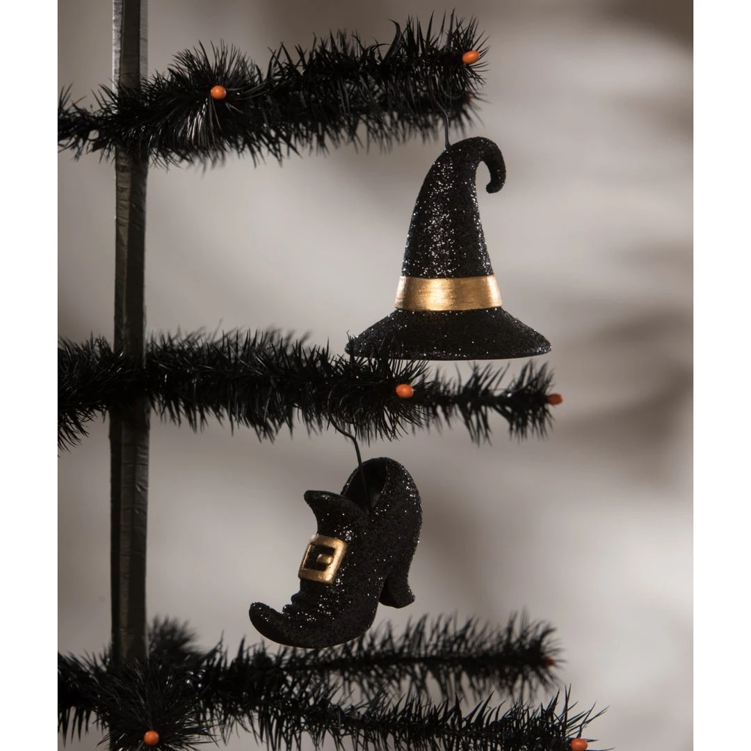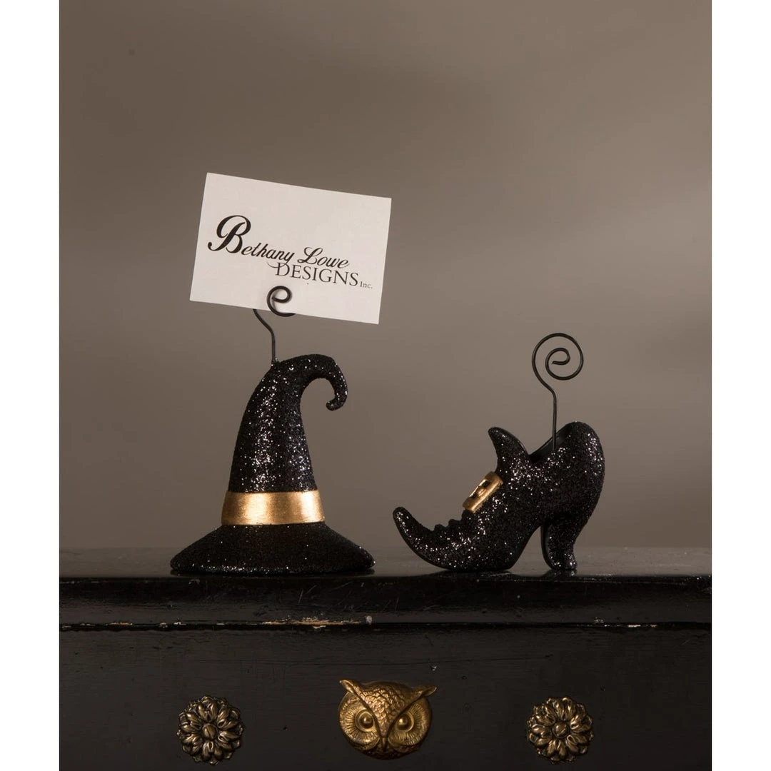 Set your Halloween table with these enchanting place card holders. A wicked witch hat and shoe covered in black glitter with gold metallic accents will catch guests’ eyes.