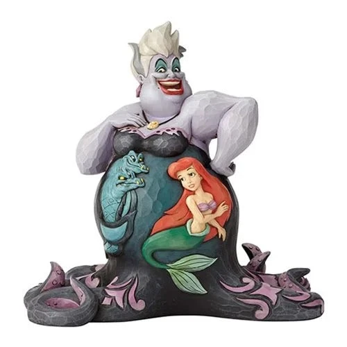 She’s not very nice, but she sure is entertaining! Artist Jim Shore captures the larger-than-life personality of Ursula in this handcrafted design. The theatrical villain’s voluptuous octopus figure is sculpted from stone resin and hand-painted in a detailed scene with Ariel, Flotsam, and Jetsam. Measuring about 8 1/2-inches wide x 8 1/4-inches tall x 6 1/4-inches long, the Disney Traditions The Little Mermaid Ursula Deep Trouble Statue by Jim Shore adds quite a colorful statement to any display!