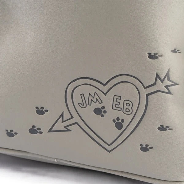 Applique, metal rivet, debossed, embroidered, printed and enamel charm details.