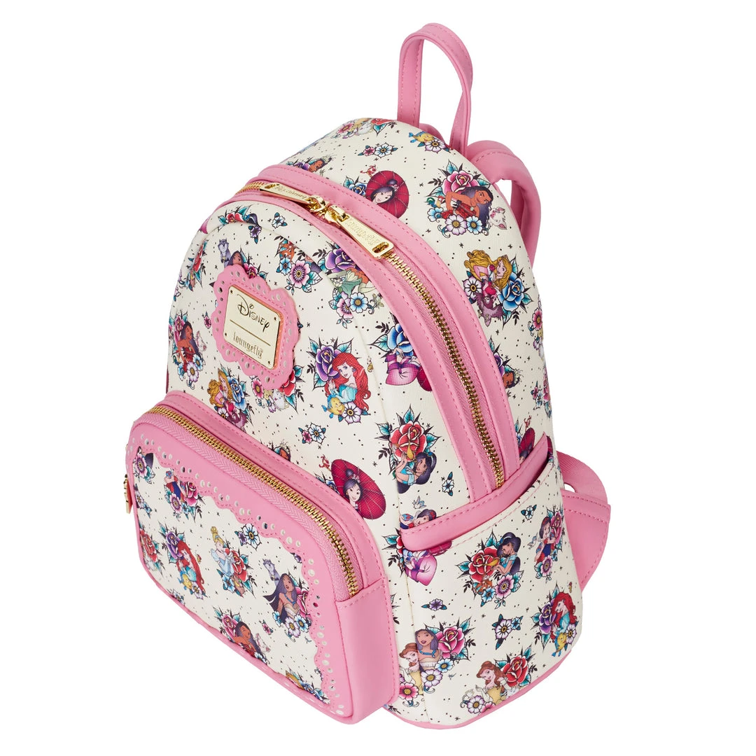 Princess power is in full bloom. Take the strength and charm of the Disney Princesses with you wherever you go with this Disney Princess Floral Tattoo Mini Backpack. A classic tattoo style rose debossed motif punctuates a cream-colored background on the backpack. The following Disney princesses can be found among the flowers: Mulan, Cinderella, Snow White, Belle, Moana, Aurora, Ariel, and Tiana.